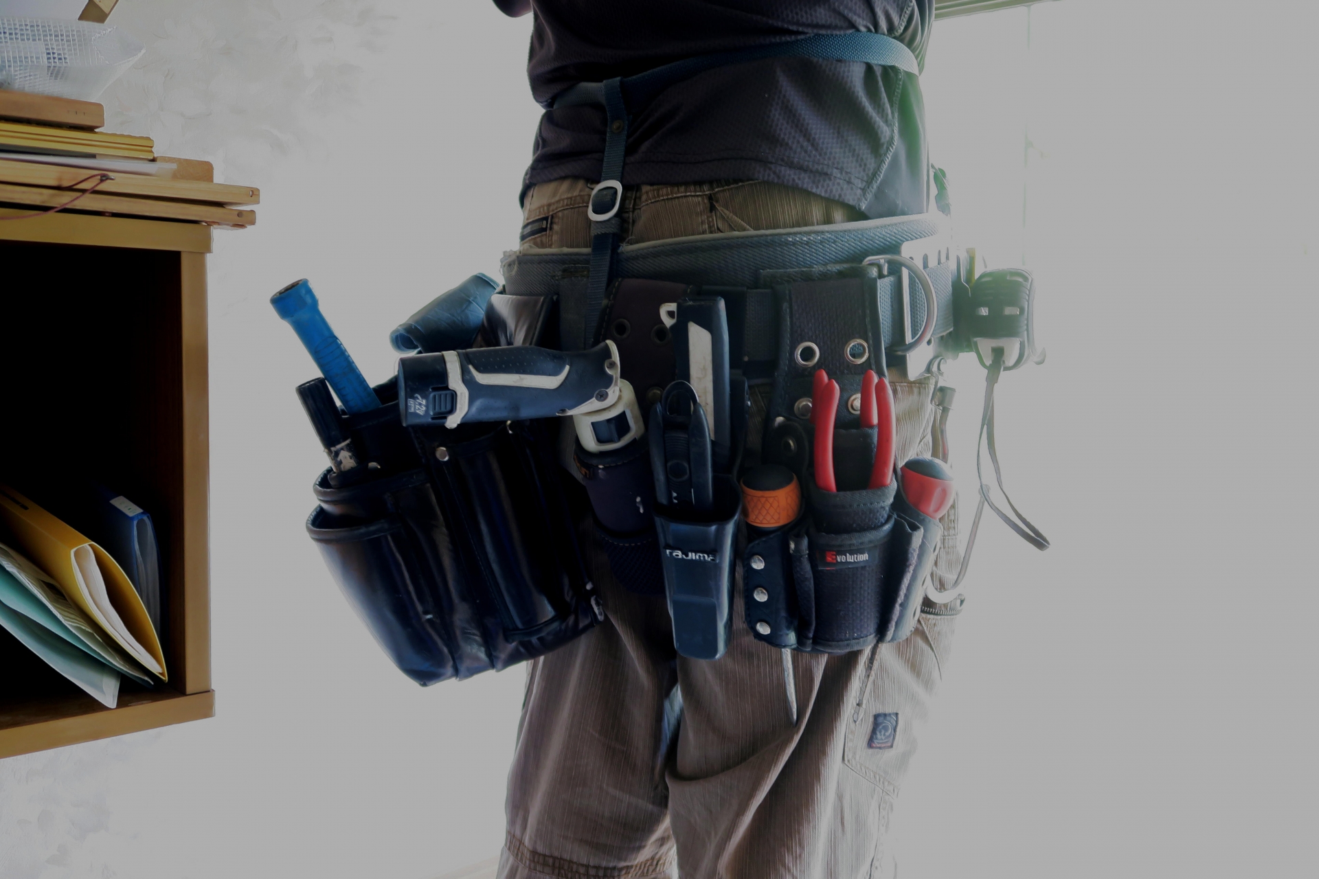 (エアコン作業の場合、エアコン室内機の下に脚立を立てて作業するので、工具を置く
